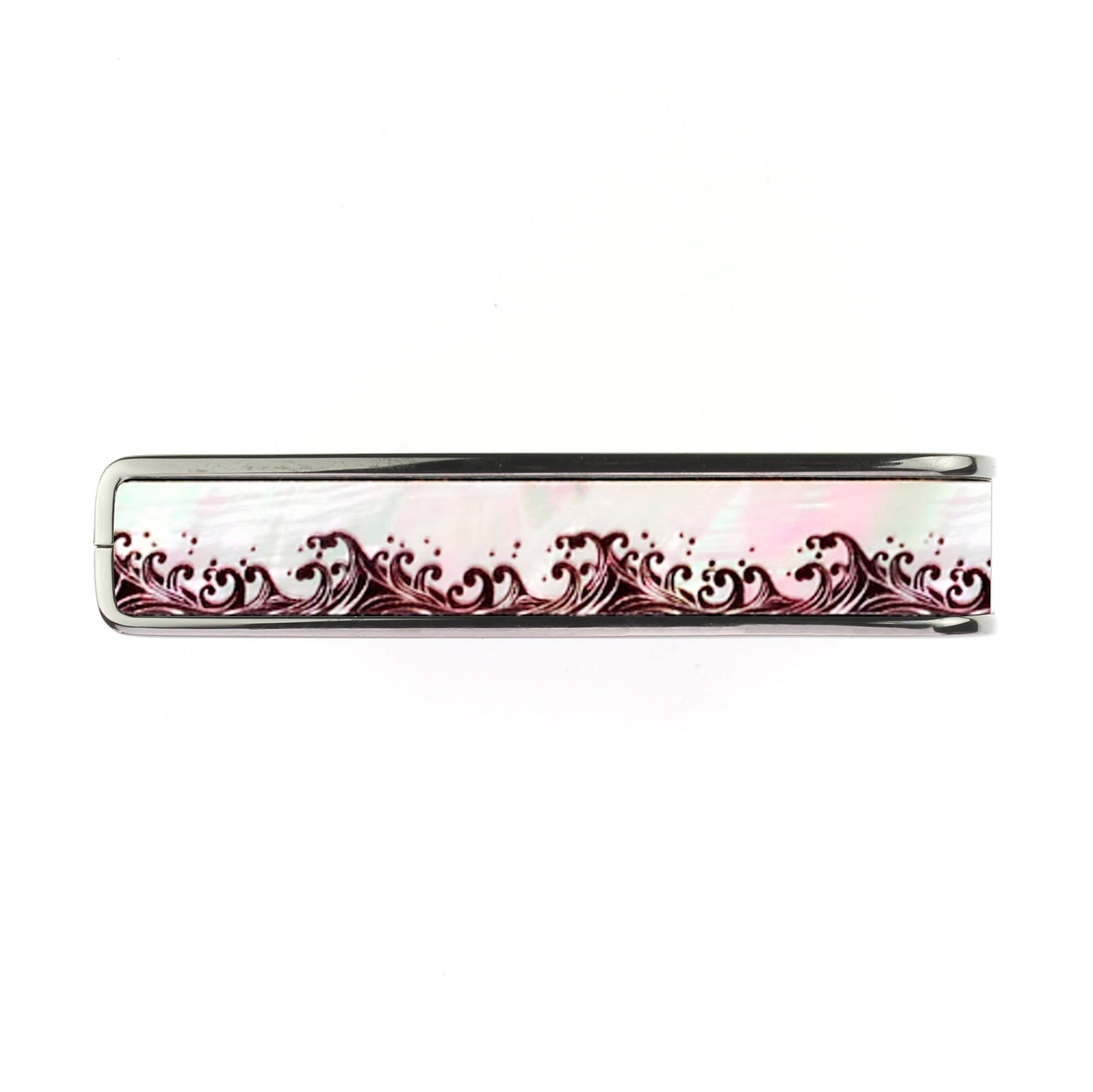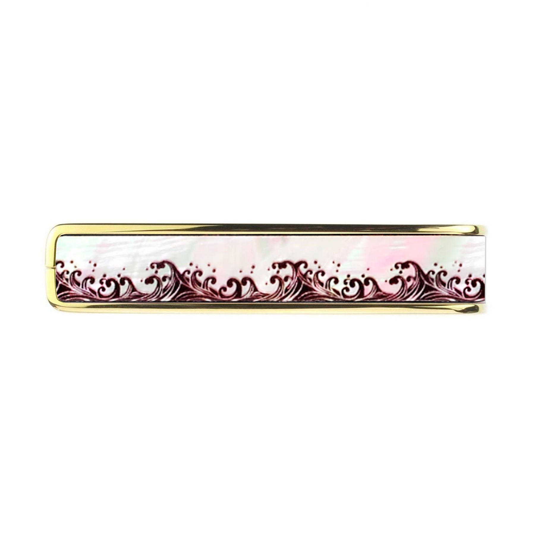 This inlay features a seamless wave pattern UV-inked onto white mother of pearl.