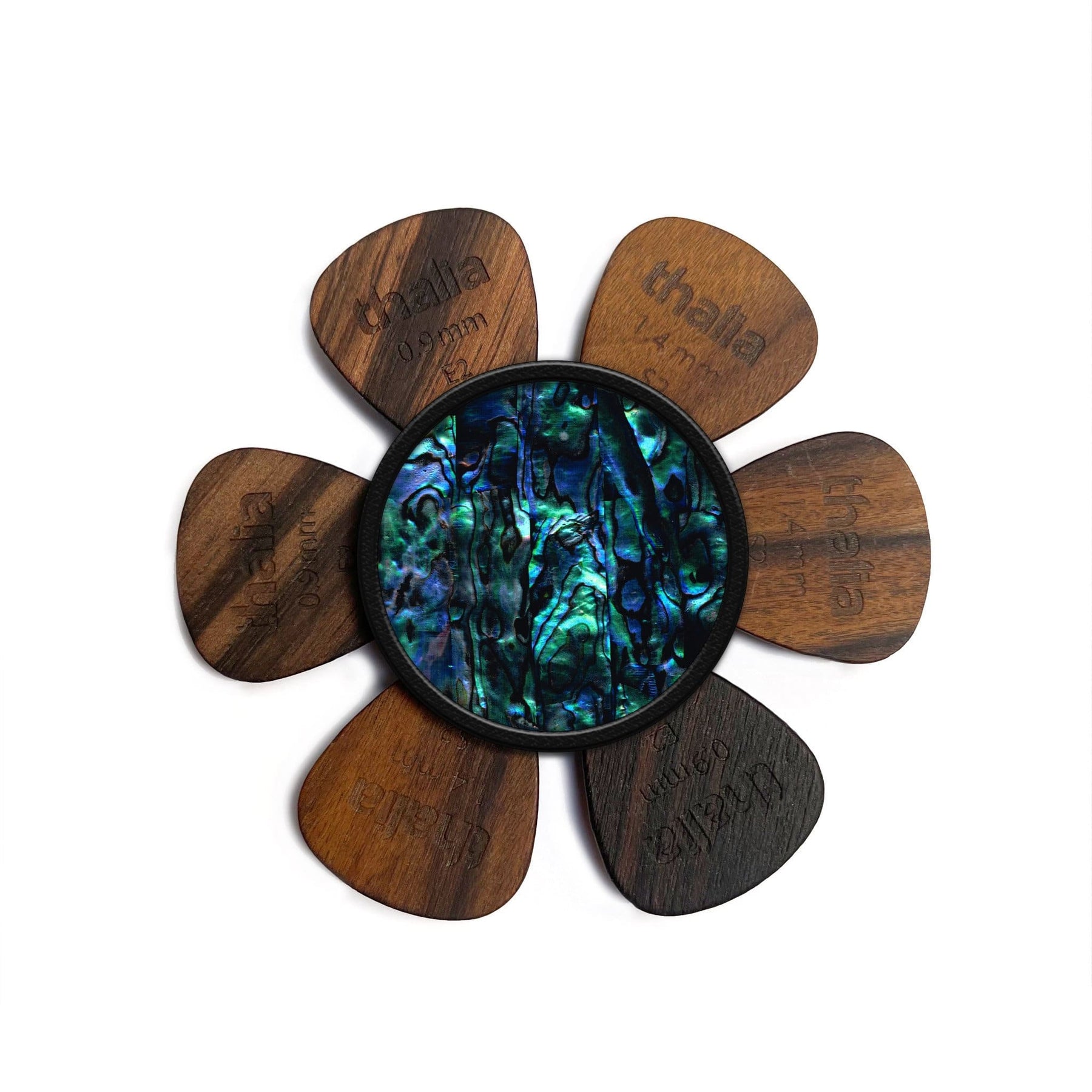 Custom inlaid with blue abalone shell, our patent-pending pick puck is the ultimate guitar pick holder. Stick anywhere that is most convenient for you! See photos below for application ideas!