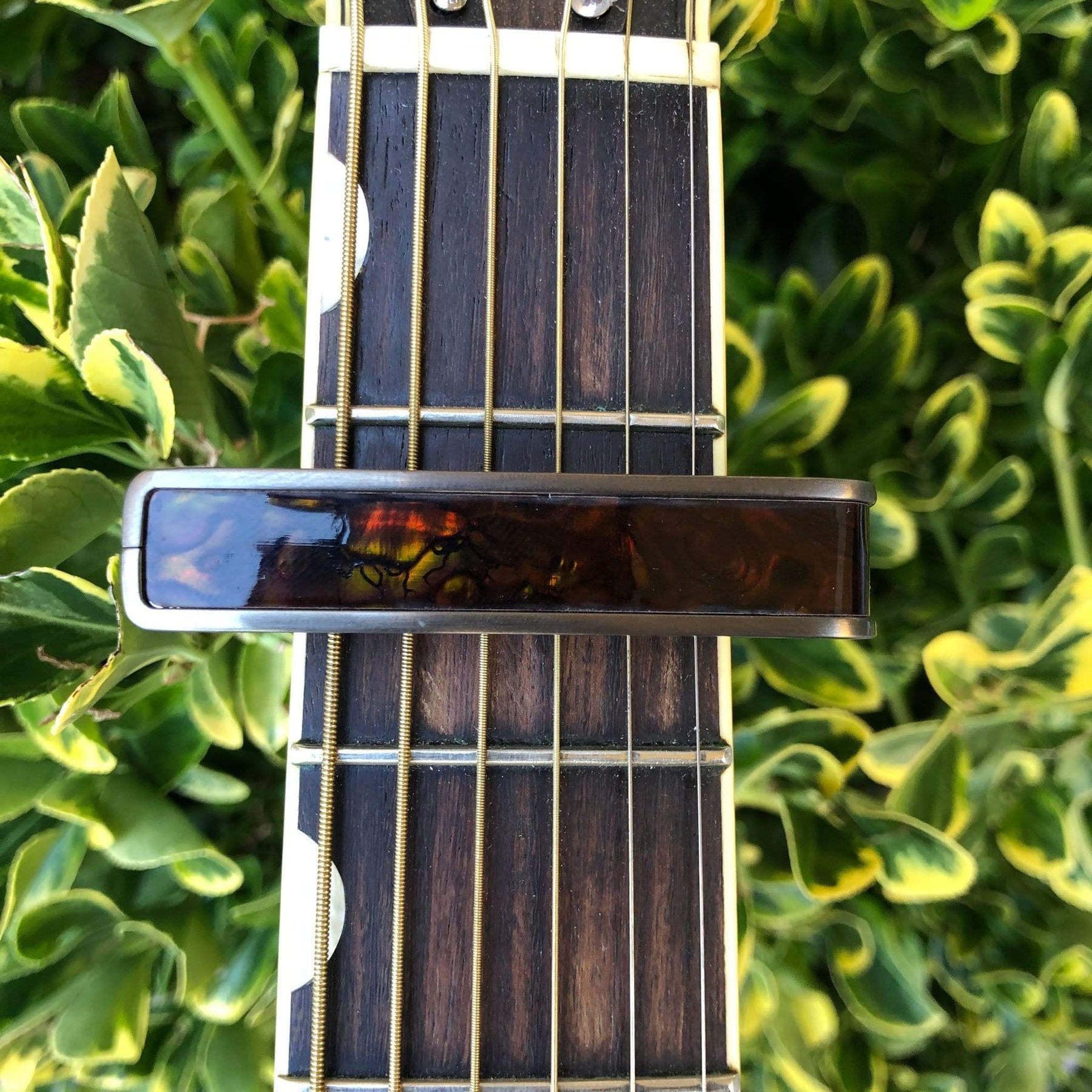 The Kentucky Bourbon guitar capo is inspired by the rich coloring of a smooth Kentucky Bourbon, featuring deep tones that are less orange than our Tennessee Whisky Wing and more subdued than its cousin, the Tennessee Tiger Rye. Perfect for players who are looking for an eye-catching flair without overpowering their instrument.