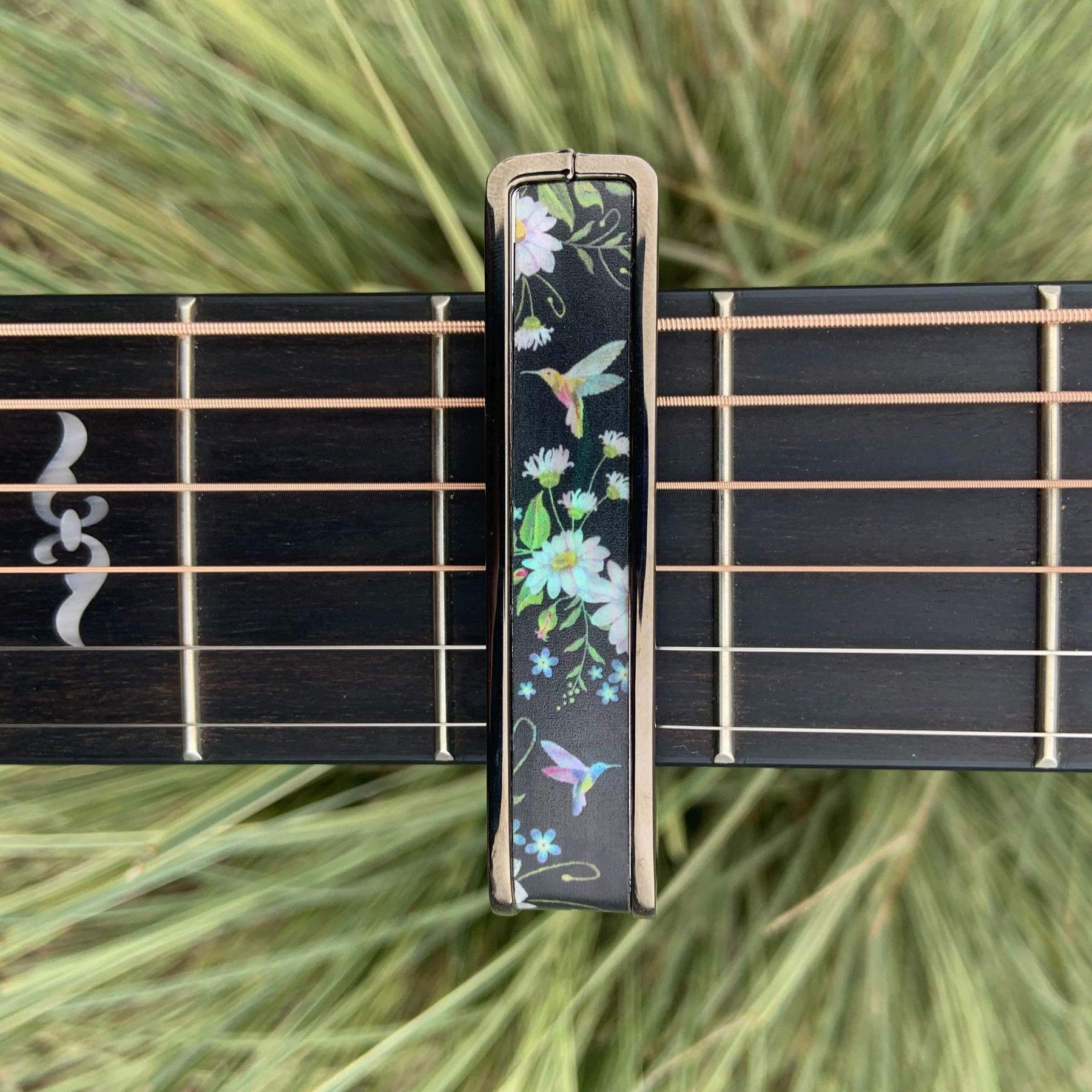 This Limited Edition Capo features two beautiful hummingbirds dancing amongst the flowers, UV embossed onto white pearl.